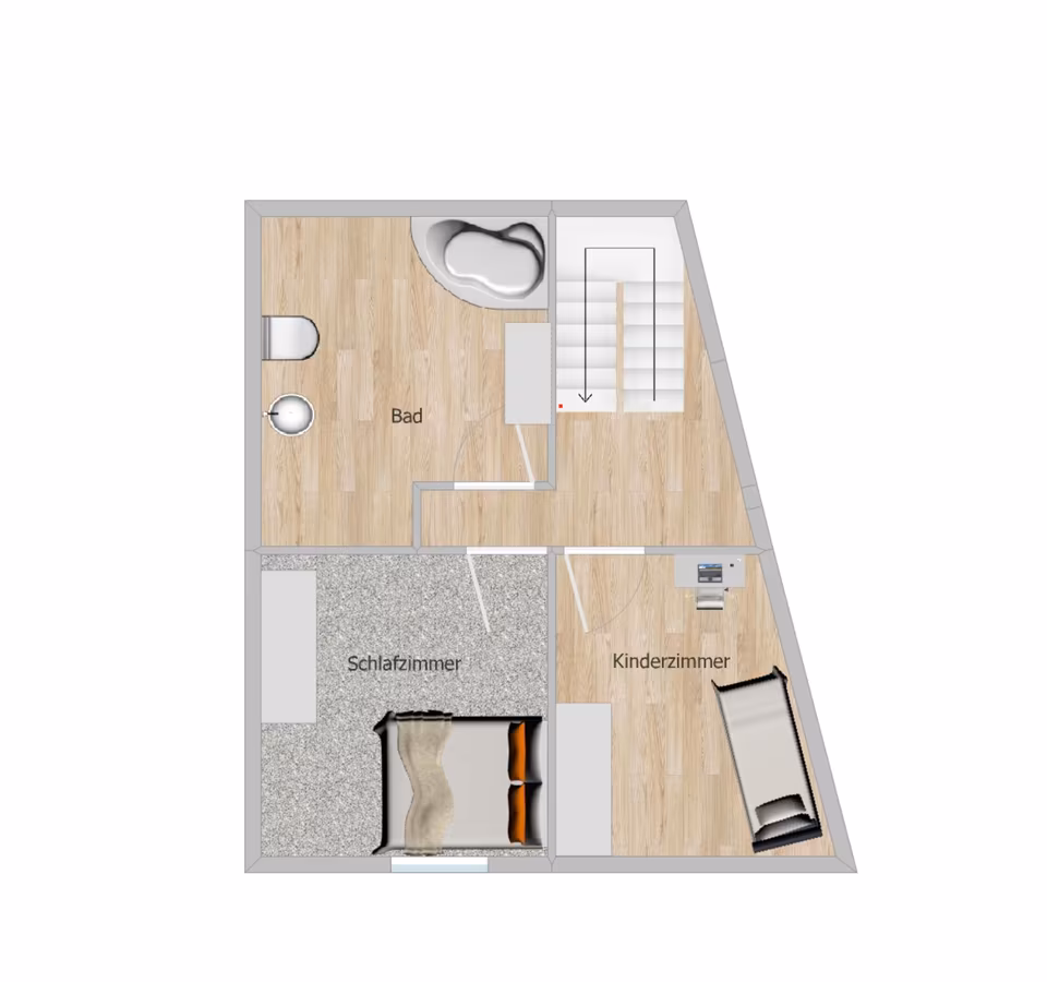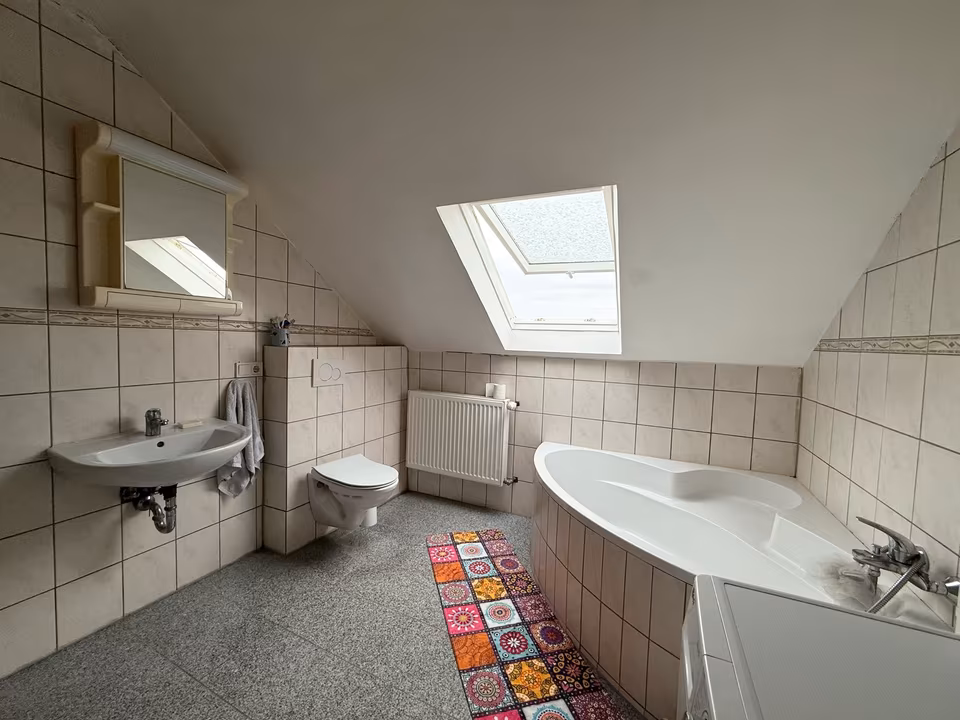 Über eine kleine Treppe mit Galerie gelangen Sie in die 2.Etage der Wohnung. Dort befindet sich das Schlafzimmer, sowie ein Kinderzimmer. Das großzügige Tageslicht-Bad wird durch eine Eckbadewanne abgerundet.