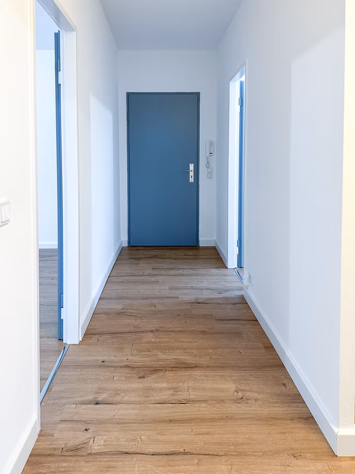 Sie betreten die Wohnung über den zentral gelegenen Flur, der als Verteiler zu allen Räumen dient und einen angenehmen ersten Eindruck vermittelt. Direkt links vom Eingang befindet sich die Küche, die kompakt und funktional gestaltet ist. Hier lässt sich eine praktische Küchenzeile problemlos unterbringen, und die Nähe zum Wohnbereich sorgt für kurze Wege im Alltag.